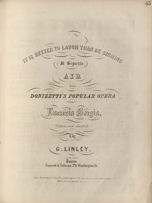 Air from 'Lucrezia Borgia.' Arranged by George Linley. Circa 1858 to 1861. Bates catalog record.